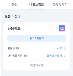 예를들어, ‘금융퀴즈, 환율맞추기, 오늘이자’ 같은 간단한 미션을 수행하여보상을 받도록 구성되어 있는 미션 요소입니다.
