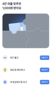 사용자는 ‘퀴즈풀기’,‘세금 정보 확인하기,’‘현금영수증 보고서 보기’등의간단한 활동을 수행하면서 퍼즐 조각을 모아완성하면 현금 보상을 받을 수 있는 미션 요소입니다.