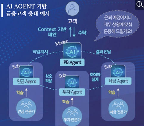 "금융 AI 에이전트" 란? LLM기반으로 자연어를 이해하고 사용자와 상호작용하며 사용자에게 다양한 금융 정보 제공과 스스로 업무 처리를 실행하여 결과를 사용자에게 제공해 주는 목표, 행동중심의 소프트웨어 입니다. RAG, 다른 에이전트들과 연합하고 사람과 업무적 협력 관계인 디지털 워커로서의 위치를 가지고 있는 서비스 입니다.