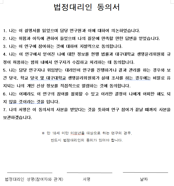본인은 위 내용을 충분히 읽고 이해했으며, 자녀가 본 연구의 설문에 참여하는 것에 동의합니다.