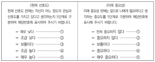 2. 다음에 제시된 평생학습 프로그램 분야에 관하여 귀하의 1) 현재 선호도 수준과 2) (가까운) 미래 중요 수준을 체크하여 주십시오.