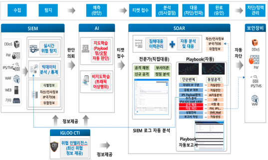 ● 각 보안 장비 및 솔루션과의 인터페이스를 제공하여 사이버 위협에 대한 자동 대응이 가능하도록 상호 운용성을 갖춘 구조를 지원합니다.